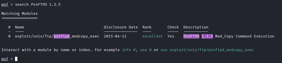 Görüldüğü üzere port 21 de zafiyetli ftp versiyonu olan ProFTPD 1.3.5 çalışmaktadır. Bu versiyon bilgisini kopyalayıp Metasploit üzerinde arama yapalım.